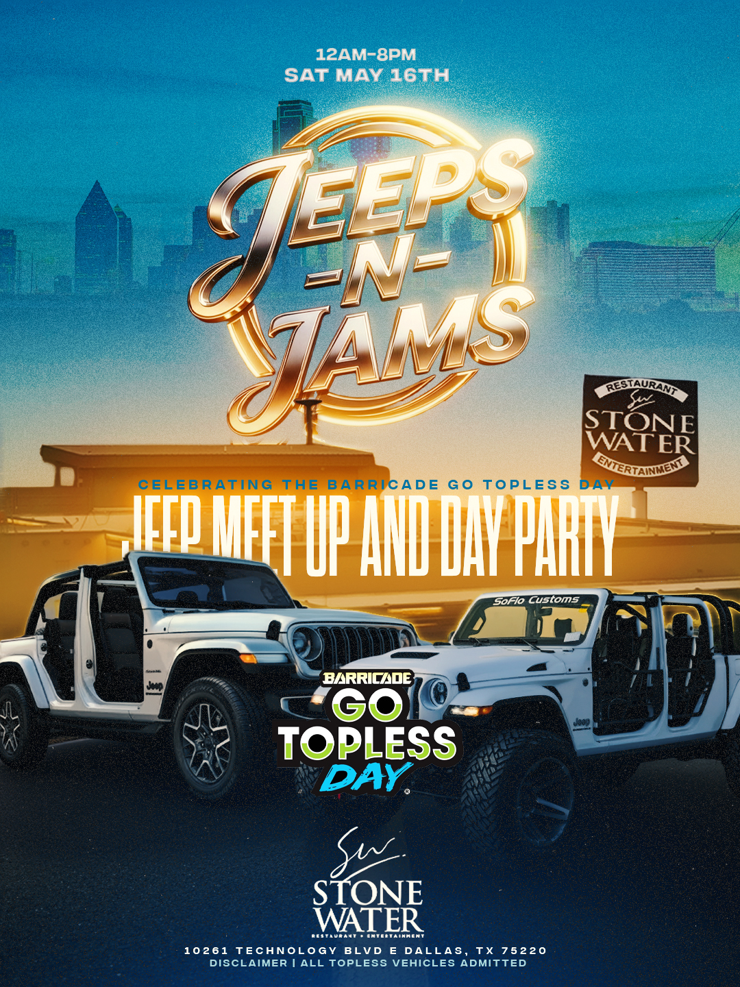 JEEPS-N-JAMS brings the Dallas Jeep community together for a full-day lifestyle event at Stone Water. Expect custom Jeeps, topless builds, club roll-ins, food and drink specials, hookah, vendors, music, contests, giveaways, and premium patio energy.