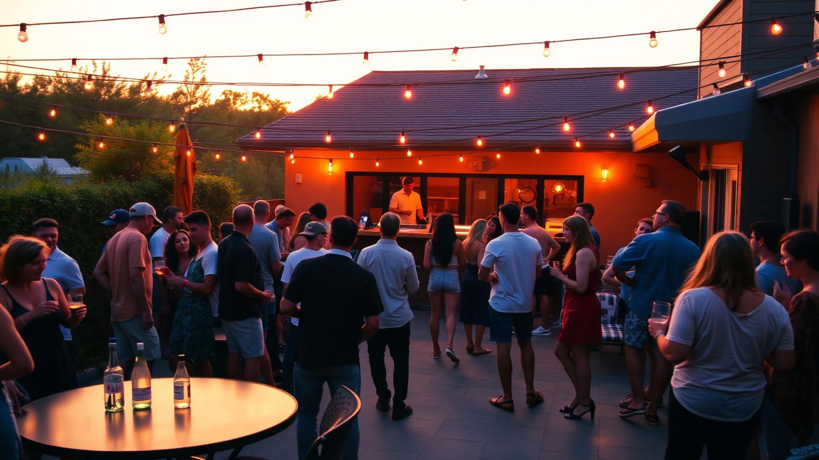 DJ, patio vibes, awards, group photo moment, food, drinks, and final celebration.